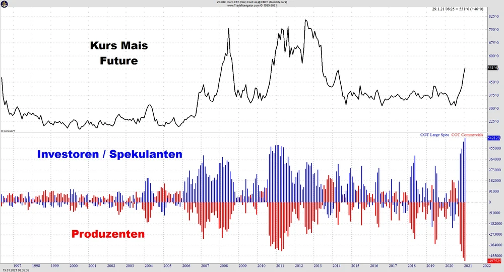 Investoren und Spekulanten sind so long positioniert wie noch nie seit die Aufzeichnungen begonnen haben. Die Gegenseite halten die Produzenten, die so short sind wie noch nie. Doch wer behält recht? In der Vergangenheit hat sich immer wieder gezeigt, dass die Produzenten über die besseren Informationen hinsichtlich ihres "eigenen" Marktes verfügen. Insofern ist davon auszugehen, dass es auch in den Agrarrohstoff-Märkten in den nächsten Wochen zu Rücksetzern kommen kann.