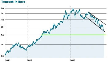 Tencent ist nach Facebook das weltweit zweitgrößte Soziale Netzwerk, der mit Abstand führende Entwickler von Online-Games mit Ablegern bei Künstlicher Intelligenz, dem E-Commerce und der Cloud. Kurzum: Tencent ist klasse!. Der Haken: Die Aktie läuft derzeit nicht (wie sämtliche China-Tech-Werte) und verliert am Mittwoch weiter an Boden. Kurzfristig bietet sich aus charttechnischer Sicht ein Einstieg auf Höhe der Untestützung bei 30 Euro an. Langfristig ist die Aktie eigentlich immer ein Kauf.