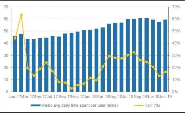 Weibo steht mit seiner Plattform unter massivem Wettbewerbsdruck, vor allem bei Videos. Dennoch ist es dem Unternehmen gelungen, eine Umgebung zu schaffen, auf der sich 2018 nicht nur Millionen neuer Kunden (+70 Mio. 2017/18) tummelten – diese verbrachten auch mehr Zeit auf Weibo, was hinsichtlich der Vermarktung von Online-Werbung positiv ist.