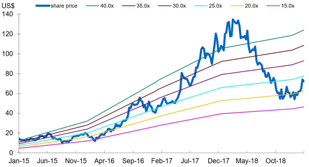 Ein solcher wäre nach Einschätzung des AKTIONÄR allerdings auch nicht angebracht. Fundamental ist die Aktie mit KGV 24 günstig bewertet. Hier ein Überblick über Weibos KGV relativ zur Kursentwicklung: