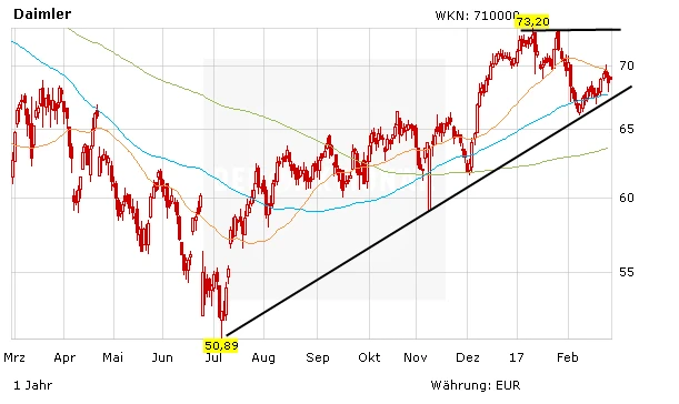 Auch Daimler wird den Umbruch in der Autoindustrie meistern. Das Management macht einen klasse Job, steckt Milliarden in die Elektromobilität und neue Mobilitätsdienste. Daimler lehnt sich auch weit aus dem Fenster, was der Deal mit Uber zeigt. Die Aktie hat zuletzt bis auf die 90-Tage-Linie konsolidiert. In einem freundlichen Gesamtmarkt, sollte das Papier wieder Kurs in Richtung 72 bis 74 Euro nehmen.