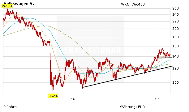 Die VW-Aktie bleibt der spekulativste Titel unter den deutschen Autowerten. Die Wolfsburger haben trotz Abgas-Skandal sehr gute Zahlen präsentiert. Die Aktie sieht technisch gut aus. Überwindet der DAX-Titel die 38-Tage-Linie bei 145 Euro, hat das Papier wieder Luft nach oben.