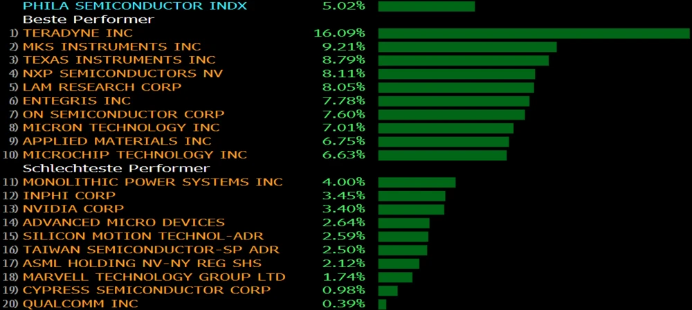 Ebenfalls deutliche Kursgewinne nach den Zahlen verzeichnet Teradyne. Satte 15 Prozent schießt die Aktie am Mittwoch nach oben – neues Mehrjahreshoch. Der US-Konzern übertraf im Q2 die Schätzungen der Analysten und hat die Prognose angehoben.