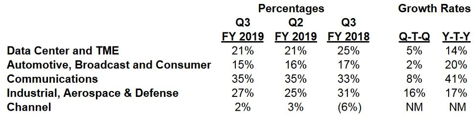 Besonders stark war im dritten Quartal die Sparte „Communications“ – hier fasst Xilinx die FPGAs zusammen, die bei der drahtlosen Kommunikation eingesetzt werden. Treibender Faktor waren hier der fortschreitende 5G-Ausbau in Süd-Korea und die 5G-Vorbereitungen in China und Nordamerika aber auch immer noch notwendige LTE-Upgrades. Die Sparte, die mittlerweile 35 Prozent des Umsatzes ausmacht, wuchs dabei gegenüber dem Vorjahr um 41 Prozent.