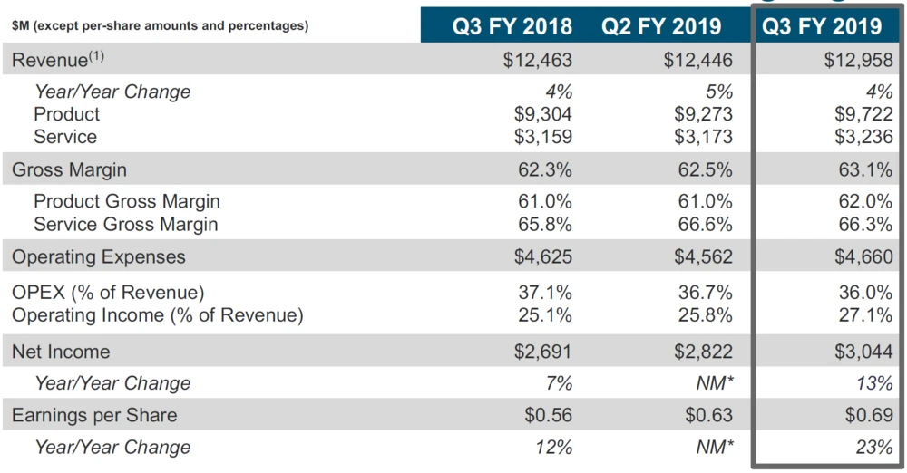 Cisco hat im dritten Quartal 2019 (bis 27. April) das sechste Mal in Folge ein Umsatzwachstum erzielt. Der Umsatz des US-Konzerns stieg um sechs Prozent gegenüber dem Vorjahresquartal auf 12,96 Milliarden Dollar und lag damit leicht über den Erwartungen der Analysten von 12,89 Milliarden Dollar.