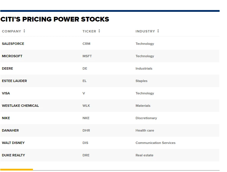 Der Stratege führte eine Liste von Unternehmen an, die in der Vergangenheit in der Lage waren, die Preise zu erhöhen, um mit der Inflation Schritt zu halten – darunter der Software-Riese Microsoft, der Maschinenhersteller Deere und der Zahlungsabwickler Visa.