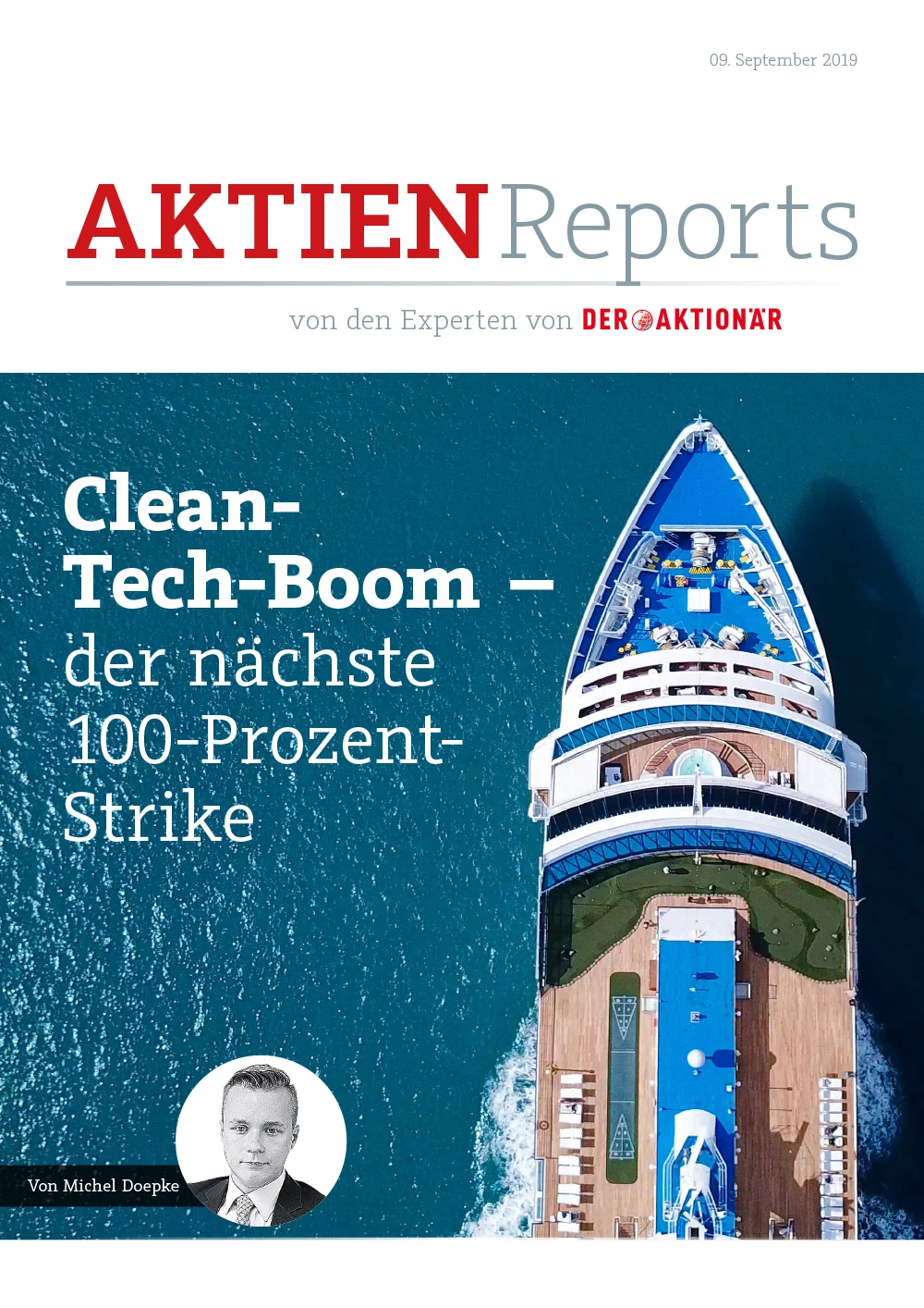 Michel Doepke hat sich auf den Grund zahlreicher Geschäftsberichte begeben und eine Clean-Tech-Perle gefunden, die aktuell noch unter dem Radar vieler Analysten läuft, aber demnächst auftauchen wird. Nach den beiden letzten Volltreffern (Nel und Hydrogenics) in seinen Aktienreports hat auch diese Umwelt-Aktie absolutes Verdopplungspotential. Das Unternehmen entwickelt komplett saubere Schiffsysteme und trifft damit den Nerv der Zeit. Der Bedarf ist enorm hoch, die Auftragsbücher prall gefüllt. Wenn Sie einen Hidden Champion beim Gang ans Licht begleiten wollen, ist dieser Aktienreport Ihr Highlight.