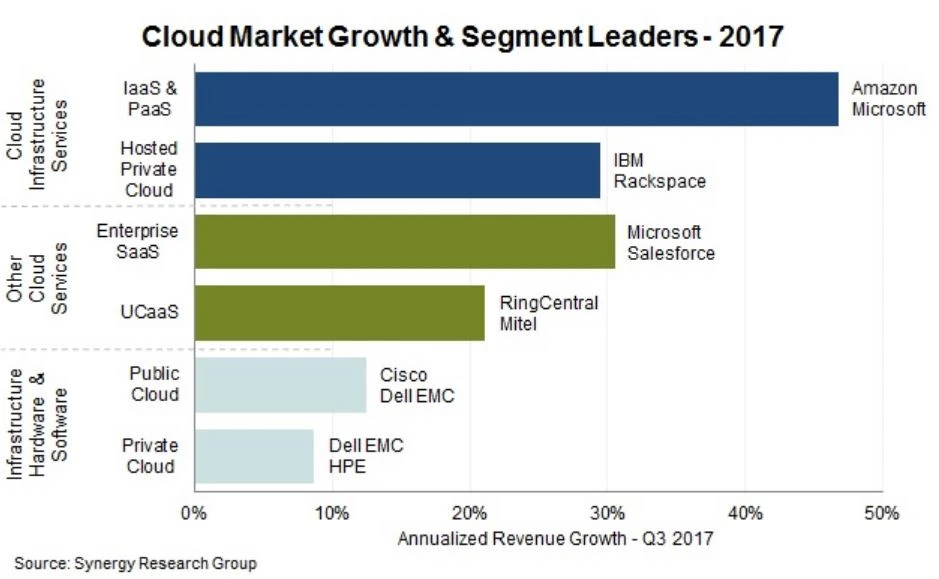 Erst vor wenigen Jahren rückten Cloud-Lösungen in den Mainstream auf – heute dominieren sie viele Bereiche des IT-Marktes. Das rasante Wachstum der Cloud-Anfänge ist dabei nicht verschwunden. Laut neuen Zahlen von Synergy Research ist der gesamte Cloud Markt 2017 im Durchschnitt um 24 Prozent gewachsen. Cloud-Anbieter wie Amazon, Microsoft oder Cisco setzten insgesamt 180 Milliarden Dollar um.