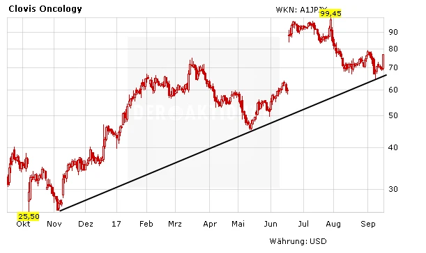 Trotz des Anstiegs von rund zehn Prozent bleibt die Clovis-Oncology-Aktie für risikobewusste Anleger ein Spekulationsobjekt. Weitere Übernahmegerüchte dürften den Titel zusätzlichen Auftrieb verleihen. Auch das Chartbild hat sich wieder aufgehellt. Spekulanten greifen mit einem Stopp bei 55 Euro zu.