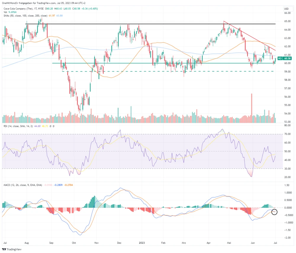 Gleichzeitig hat ein Investment jetzt hohe Chancen, zügig mit ersten Kursgewinnen belohnt zu werden. Denn im Unterstützungsbereich zwischen 59 und 60 Dollar gibt die Aktie zunehmend eine gute Figur ab. Zwar handelt Coca-Cola seit Ende April in einem kurzfristigen Abwärtstrend, der hat die Unterstützung aber nicht ernsthaft in Bedrängnis bringen können. Dadurch ist der mittelfristige Seitwärtstrend unverändert intakt.