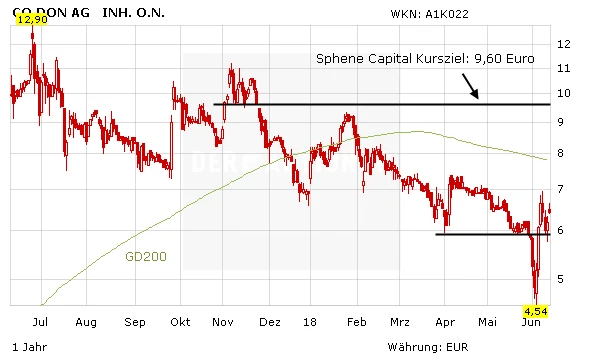 Die Aktie von Co.don reagierte mit einem Kursplus von 3,7 Prozent auf die Meldung. Bereits vor gut einer Woche ist die Aktie kräftig nach oben durchgestartet, nachdem das Analysehaus Sphene Capital seine Kaufempfehlung mit einem 24-Monats-Kursziel von 9,60 Euro bestätigt hatte. Nach dem jüngsten deutlichen Kursanstieg bedeutet dies ein verbleibendes Potenzial von noch immer rund 50 Prozent.