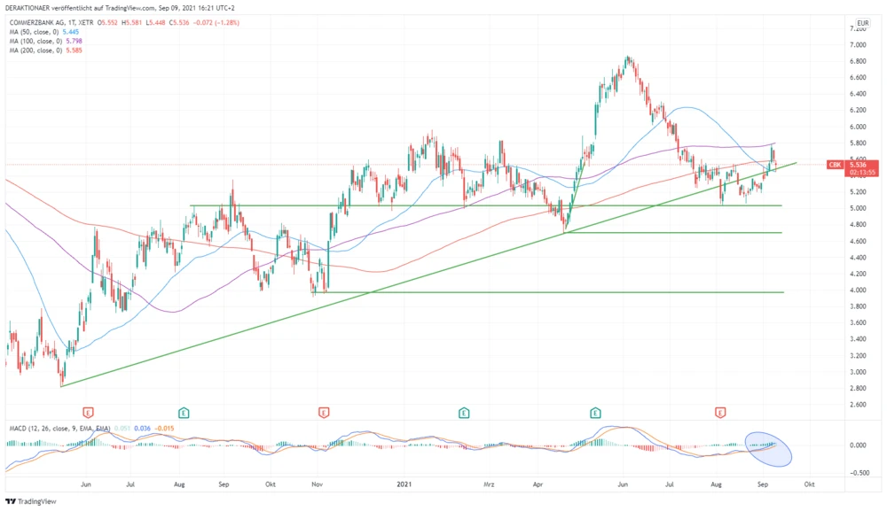 Nach der steilen Aufwärtsrallye im Frühling ging es für die Commerzbank-Aktie schnell wieder Richtung Süden. Ausgehend vom Mehrjahreshoch bei 6,87 Euro fiel der Titel unter alle gängigen Gleitenden Durchschnittslinien und schließlich Anfang August unter die mittelfristige Aufwärtstrendlinie bei 5,27 Euro. An der mehrfach getesteten 5-Euro-Marke glückte dann aber der Rebound und der Wert kletterte in dieser Woche wieder über die 50- und die 200-Tage-Linie bei 5,46 und 5,58 Euro.