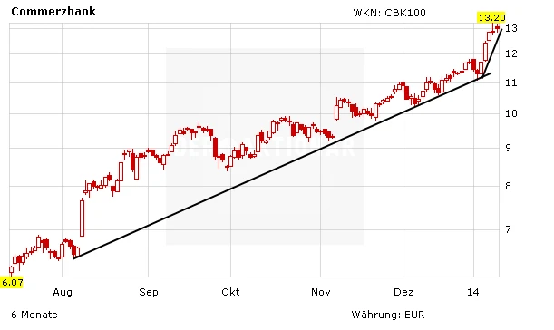 Der deutsche Aktienmarkt dürfte am Montag freundlich in den Handel starten. Starke neue Impulse fehlen nach dem Arbeitsmarktbericht vom Freitag allerdings. Die Commerzbank-Aktie klettert im frühen Handel wieder über die Marke von 13 Euro. Damit hat der Aufwärtstrend weiter an Dynamik gewonnen. Nach dem Sprung über die horizontale Widerstandslinie bei zwölf Euro, wurde zum Wochenschluss auch der seit zwei Jahren gültige Abwärtstrend überwunden.