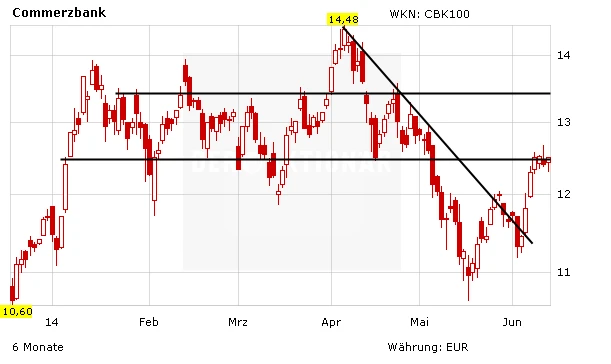 Sicher ist die Commerzbank mit einem Börsenwert von 14 Milliarden Euro kein Schnäppchen mehr. Allerdings hat die Aktie nach wie vor starkes Momentum. Investierte Anleger sollten nun die neuen, wichtigen charttechnischen Marken beachten. Zunächst kommt es darauf an, dass der Widerstand bei 12,50 Euro überwunden wird. Sollte dies der Fall sein, hätte die Commerzbank Platz bis 13,50 Euro. Trader, die die wochenlange Kursschwäche zum Einstieg genutzt hatten, bleiben dabei und heben den Stoppkurs auf 11,70 Euro an. Wer an einem Einstieg interessiert ist, sollte ein Stop-Buy-Limit bei 12,60 Euro legen.