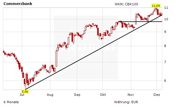 Die Aktie der Commerzbank hat seit ihrem Tief im Sommer mittlerweile um stolze 90 Prozent zugelegt. Um 80 Prozent erhöht werden nun die Öffnungszeiten einer Pilotfiliale in Berlin – ihr Konzept findet bei der Kundschaft offenbar Anklang.