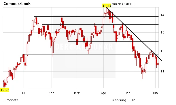 Nach den heftigen Verlusten vom Vortag gewinnt die Commerzbank-Aktie am Mittwoch 0,5 Prozent auf 11,38 Euro. Damit beträgt das Minus seit dem Hoch im April 20 Prozent. Das durchschnittliche Kursziel der Analysten lautet 12,82 Euro. Also hat die Aktie nach Einschätzung der Experten lediglich ein Potenzial von 13 Prozent.