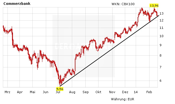 Bei der Commerzbank-Aktie geht es jetzt darum, ob der seit Juli gültige Aufwärtstrend hält. Bleibt er intakt, sollte die Aktie schnell wieder Fahrt aufnehmen. Mittelfristig sind Kurse um 16 Euro drin. Investierte Anleger bleiben dabei und sichern ihre Position mit einem Stopp bei 11,50 Euro ab.