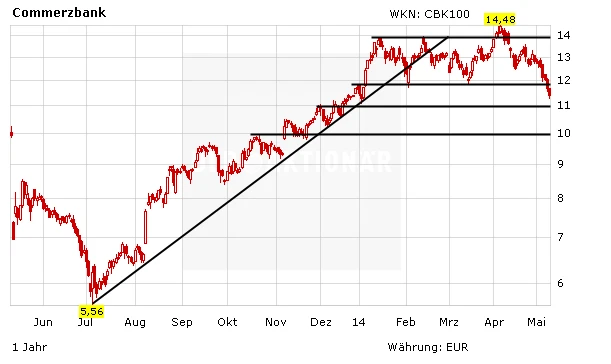 Die Commerzbank ist aus Sicht des Charttechnikers derzeit kein Kauf. Das Unterschreiten der Unterstützung bei 11,80 Euro hat ein Abwärtspotenzial bis 10,00 Euro freigesetzt.