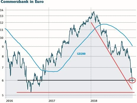 Nach moderaten Zuwächsen, konnte die Commerzbank-Aktie den gestrigen Handelstag noch knapp an der wichtigen 6-Euro-Marke abschließen. Diese wurde seit November 2016 nicht unterschritten. Zu Beginn des heutigen Handelstags kämpfte sie noch um diese Unterstützung, gab dann weiter aber nach. Aktuell liegt das Papier bei 5,91 Euro.