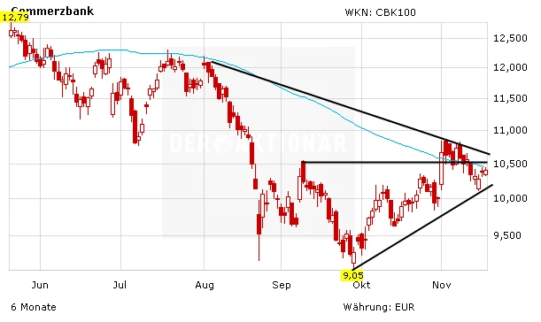 Obwohl sich zuletzt vor allem die Bären unter den Analysten zu Wort gemeldet haben, legt die Aktie der Commerzbank am Donnerstag weiter zu. So hat Matthew Clark am Mittwoch sein „Neutral“-Rating für die Commerzbank mit Kursziel 12,70 Euro bestätigt. Guillaume Tiberghi von Exane BNP Paribas sagt ebenfalls „Neutral“ mit Kursziel zwölf Euro.