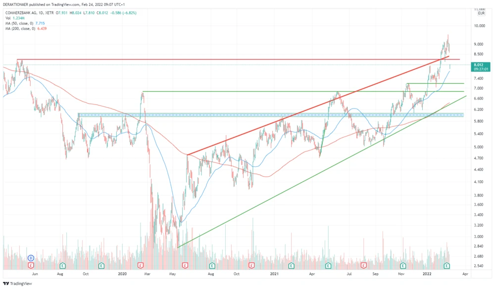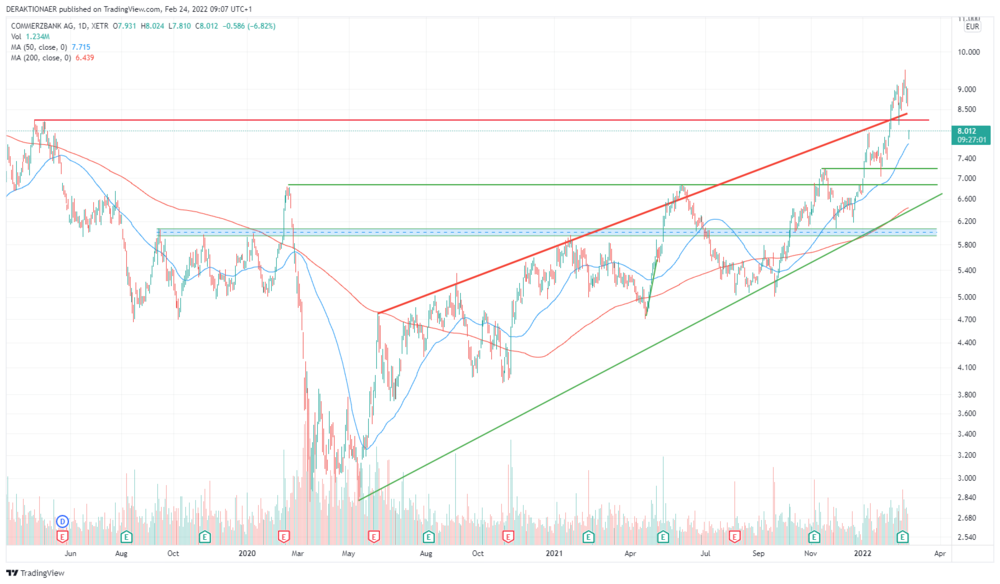 Die Meldung über den Kriegsbeginn in der Ukraine sorgt für einen Abverkauf an den Börsen. Die Commerzbank-Aktie musste vorbörslich in der Spitze über neun Prozent an Wert abgeben. Der jüngste Aufwärtstrend infolge der expansiven Geldpolitik in der USA ist damit hinüber. Auf diese Marken müssen Anleger in den nächsten Tagen schauen.