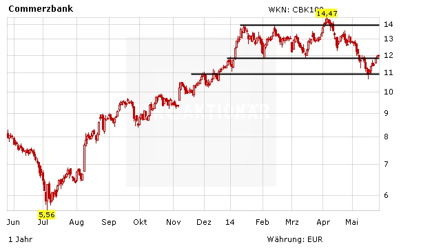 Charttechnisch ist die Lage bei der Commerzbank nach wie vor spannend. Bullen und Bären kämpfen um die 11,90-Euro-Marke. Gelingt der nachhaltige Sprung über diesen Wert, hat sich der Titel in den monatelang gültigen Seitwärtskorridor zurückgekämpft. Sollte der nachhaltige Ausbruch geschafft werden, darf der Blick langsam wieder in Richtung der oberen Begrenzung der Range bei rund 14 Euro gehen. Prallt der Kurs allerdings an den 11,90 Euro ab, sind zügige Kursverluste in Richtung der 10-Euro-Marke zu befürchten.