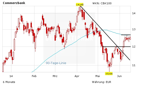 Aus charttechnischer Sicht hängt die Commerzbank-Aktie derzeit an einem Widerstand bei 12,66 Euro fest. In diesem Bereich liegt das Juni-Hoch und verläuft die 90-Tage-Linie. Gelingt der Sprung darüber, sind durchaus rasch weitere Kursgewinne zu erwarten. Die Aktie eignet sich aber weiterhin nur für risikobereite Trader. Der Stoppkurs sollte bei 11,70 Euro platziert werden.