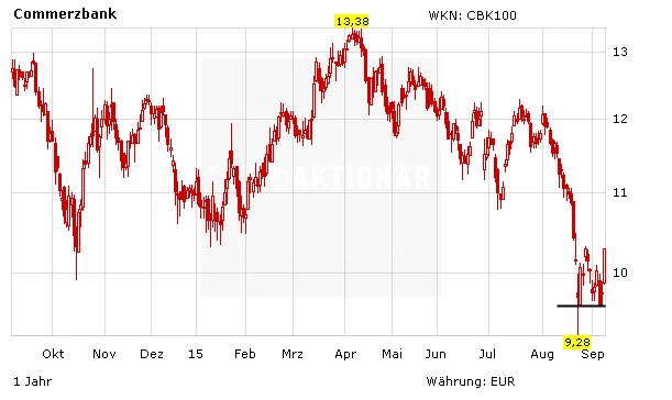 Die extrem bullishe Sicht der beiden Analysten teilt der AKTIONÄR derzeit nicht. Nachdem die Commerzbank-Aktie infolge der Börsenturbulenzen im August ausgestoppt wurde, sollten Anleger vorerst an der Seitenlinie bleiben und eine nachhaltige Bodenbildung abwarten.