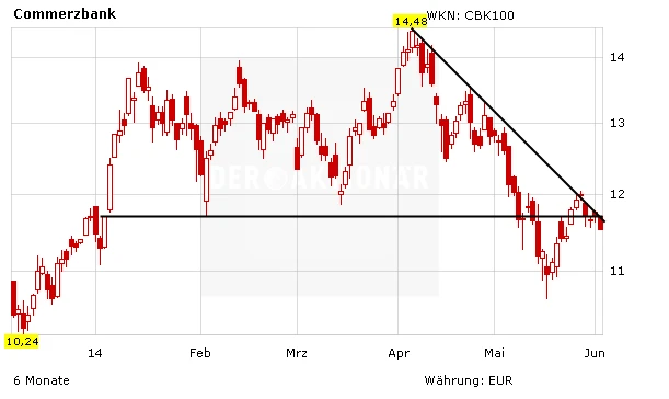 Wie der Blick auf den Kursverlauf der letzten sechs Monate zeigt, befindet sich die Commerzbank-Aktie seit Anfang April in einem intakten Abwärtstrend. Vor wenigen Tagen scheiterte der DAX-Konzern bei dem Versuch, die 12-Euro-Marke zu überwinden und damit aus diesem Trendkanal nach oben auszubrechen.