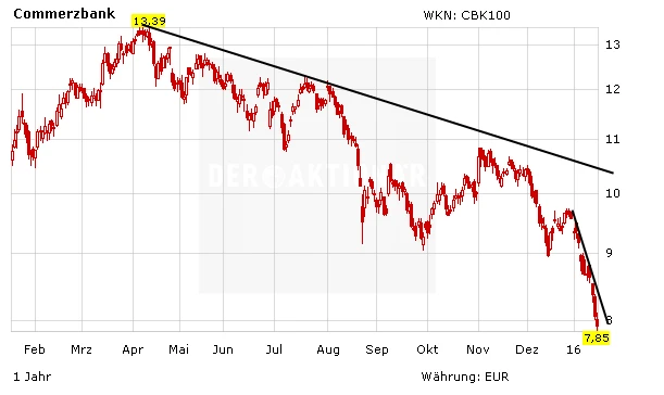 Der DAX knickt am Montag wieder ein. Zu den größten Verlierern zählen die Bank-Aktien. Die Commerzbank-Aktie notiert zum ersten Mal seit zweieinhalb Jahren wieder unter der Marke von acht Euro.