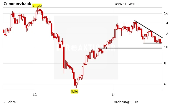 Am vergangenen Freitag hatte die Commerzbank-Aktie die Unterstützungszone um 10,65 herum unterschritten. Es drohte zum Wochenauftakt ein Absturz in Richtung der wichtigen Auffanglinie bei 10 Euro. Neben dem 50%-Fibonacci-Retracement der Aufwärtsbewegung zwischen Juli 2013 und April 2014 verläuft hier eine Horizontale. Zudem ist die Marke aus psychologischer Sicht sehr entscheidend.