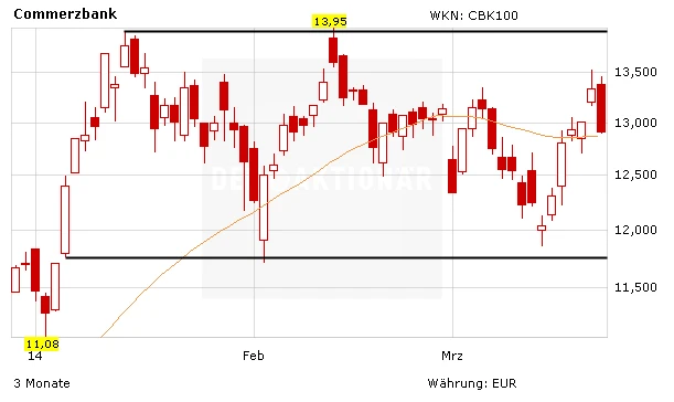 Noch besteht also die Chance, dass die Commerzbank ihren kurzfristigen Aufwärtstrend fortsetzt und an den oberen Rand der seit Jahresbeginn gültigen Seitwärtsrange heranläuft. Bis dahin fehlt der Aktie noch etwa 1,00 Euro. Sollte diese Range verlassen werden, ergäbe sich zunächst ein Kursziel von rund 16,20 Euro, das sich aus dem Ausmaß der Seitwärtsbewegung und dem Ausbruchsniveau erschließt.