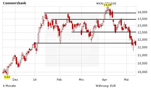 Nachrichten zur Commerzbank gibt es keine. Am Mittwoch hat sich die französische Großbank Societe Generale zu Wort gemeldet. SocGen hat die Commerzbank nach den Zahlen zum ersten Quartal auf "Buy" mit einem Kursziel von 16 Euro belassen. Bei den durchwachsenen Resultaten hätten die Erträge enttäuscht, schrieb Analyst Philip Richards in einer Studie vom Mittwoch. Dagegen sei die Kostenkontrolle robust, die Kreditqualität sei gut geblieben und die Profitabilität im Kerngeschäft erhole sich weiter. Der positive Anlagehintergrund der Aktie bleibe intakt.