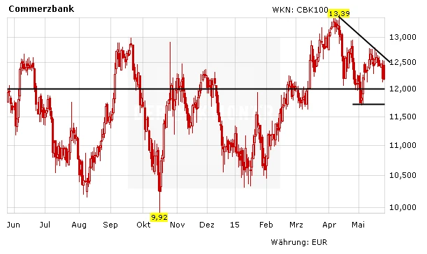 Aus charttechnischer Sicht kommt es bei der Commerzbank-Aktie vor allem darauf an, dass die psychologisch wichtige Marke von zwölf Euro hält. Sollte die Aktie darunter fallen, droht ein schnelles Abrutschen auf 11,70 Euro. Ein Kaufsignal ergebe sich, wenn der kurzfristige Abwärtstrend geknackt wird. Er verläuft aktuelle im Bereich bei 12,62 Euro.
