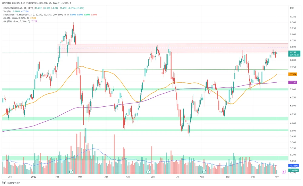 Während die Commerzbank-Aktie nach dem Test der Unterstützung bei 5,70 Euro einen stabilen Aufwärtstrend etabliert hat, stockt dieser nun an der Widerstandszone im Bereich zwischen zwischen 8,36 und 8,64 Euro. Bereits im Juni hatte die Aktie zwei Mal erfolglos versucht, sie zu durchbrechen. Im September lief sie sogar nur noch die untere Begrenzung an, ehe sie abprallte.