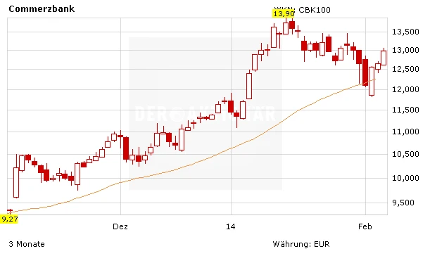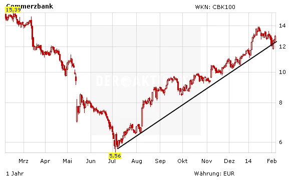 Nach dem zwischenzeitlichen Bruch des Aufwärtstrends sind die Ampeln bei der Commerzbank-Aktie aus charttechnischer Sicht wieder auf Grün umgesprungen. Die untere Begrenzung des seit dem Sommer 2013 gültigen Aufwärtstrends verläuft bei knapp über zwölf Euro – heute kratzte die Aktie bereits wieder an der 13-Euro-Marke. Neue Impulse dürfte es spätestens am 13. Februar geben, dann legt Deutschlands Nummer zwei unter den Privatbanken die Zahlen für das vierte Quartal vor.