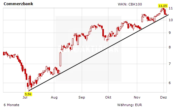 Am Mittwochvormittag fällt die Commerzbank-Aktie um 0,4 Prozent auf 10,43 Euro. Damit ist der Titel nur noch einen Hauch vom seit Juli gültigen Aufwärtstrend entfernt. Ein Unterschreiten des Trends würde ein Verkaufssignal bedeuten. Nach der famosen Rallye seit Sommer – 90 Prozent plus in gerade mal fünf Monaten – war es nur eine Frage der Zeit, bis die Commerzbank-Aktie korrigiert.