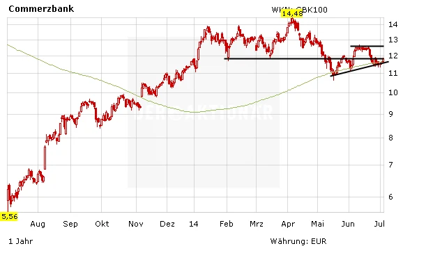Ohne Frage sieht es besser aus beim Commerzbank-Chart. Die Konsolidierung geht weiter. Langsam nimmt die Aktie Kurs auf die 12-Euro-Marke. Richtig interessant wird es allerdings erst, wenn die Aktie den Widerstand bei 12,50 Euro überwindet. Fällt der Titel allerdings nachhaltig unter die 200-Tage-Linie, könnte schon bald das Zwischentief bei 11,185 Euro erreicht werden. Investierte Anleger halten die Aktie, mit einem Neueinstieg sollte abgewartet werden, bis sich die charttechnische Situation sichtbar verbessert hat.