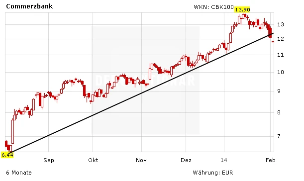 Die Commerzbank-Aktie gerät am Dienstag weiter unter Druck. Im frühen Handel fällt der Titel um vier Prozent auf 11,86 Euro und rutscht unter den seit Sommer 2013 gültigen Aufwärtstrend. Die Aktie der zweitgrößten deutschen Bank dürfte bald unter den Stoppkurs des AKTIONÄR fallen.