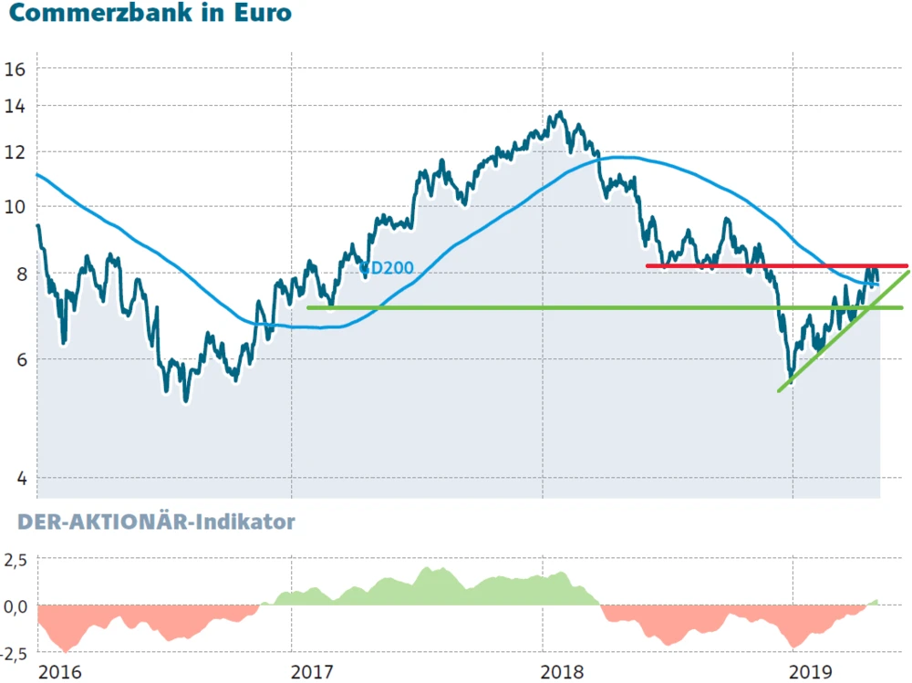 Im schwachen Gesamtmarkt startet die Commerzbank-Aktie am Montag mit einem deutlichen Abschlag von bis zu drei Prozent in den Handel. Der seit dem Jahreswechsel gültige Aufwärtstrend ist aber nach wie vor intakt. Investierte Anleger bleiben dabei und setzen auf positive Impulse durch die Quartalsbilanz.