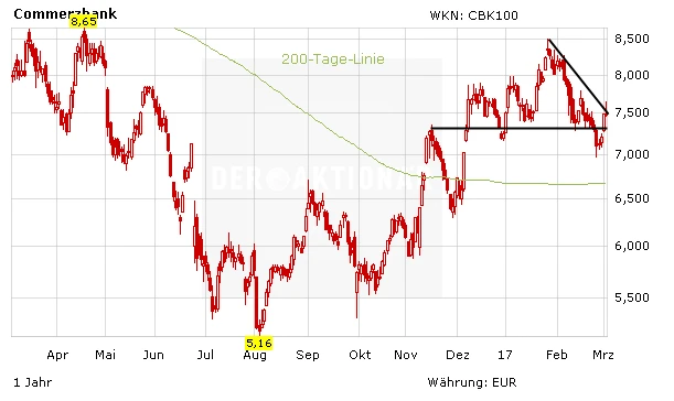 Nach dem Rücksetzer nach den gemischten Jahreszahlen hat die Commerzbank zuletzt wieder Fahrt aufgenommen und auch charttechnisch Boden gutgemacht, der Bruch des kurzfristigen Abwärtstrends bei 7,47 Euro steht kurz bevor. Als Unterstützung dient die Marke bei 7,32 Euro. Börsianer legen sich jetzt die Aktie ins Depot und setzen darauf, dass das positive Branchenumfeld anhält. Zudem sollte die Zinsfantasie in den USA und Europa den Kurs weiter stützen. DER AKTIONÄR sieht einen fairen Wert von 10,70 Euro und empfiehlt bei 6,00 Euro einen Stopp zu setzen.