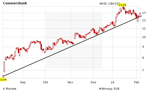 Vor den Zahlen dürfte die Commerzbank-Aktie um die Marke von 13 Euro notieren. Sollten die Zahlen gut ausfallen, dürfte der Titel schnell in Richtung 13,50 Euro laufen. Anleger sollten dabei bleiben und den Stopp bei 11,50 Euro setzen.
