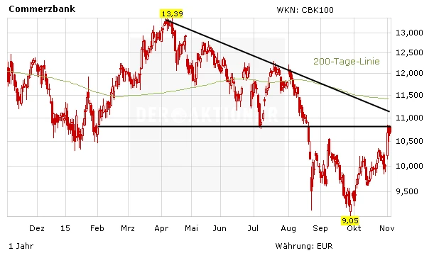 Aus charttechnischer Sicht ist die Commerzbank eine spannende Aktie. Fällt der angesprochene Widerstand, rückt der Abwärtstrend in das Visier der Marktteilnehmer. Nimmt das Papier diesen dann heraus, ist auch die 200-Tage-Linie nicht mehr weit entfernt. Kurzum, die Commerzbank ist das perfekte Spielzeug für Trader. DER AKTIONÄR hat sich bereits im 10-Prozent-Plus-Depot positioniert.