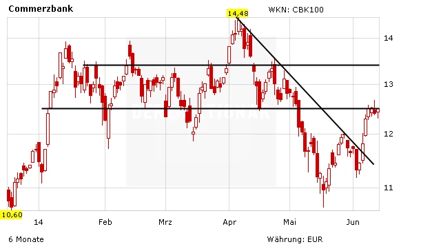 Sollte der Ausbruch über die 12,50-Euro-Marke gelingen, hätte die Commerzbank Platz bis 13,50 Euro. Trader, die die wochenlange Kursschwäche zum Einstieg genutzt hatten, bleiben dabei und heben den Stoppkurs auf 11,70 Euro an. Wer an einem Einstieg interessiert ist, sollte ein Stop-Buy-Limit bei 12,60 Euro legen.
