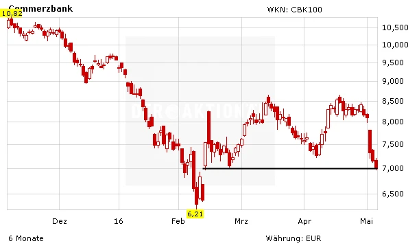 Die Commerzbank-Aktie rutscht am Freitagmorgen unter die Marke von sieben Euro. Jetzt wird’s brenzlig, denn genau hier verläuft eine überaus wichtige Unterstützung. Hält er nicht, könnte die Aktie bald das Verlaufstief bei 6,21 Euro. Hält auch diese Marke nicht, könnte es im schlimmsten Fall bis auf das Allteit-Tief bei 5,80 Euro abwärts gehen.