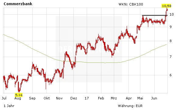 Bei der Aktie der Commerzbank ist endlich der Knoten geplatzt. Positive News zum Konzernumbau und Rückenwind von der EZB sollten auch weiterhin den Kurs treiben. Mit einem Kurs-Buchwert-Verhältnis von 0,5 und einem KGV von 13 ist der Titel unterbewertet. Wer auf steigende Zinsen in Europa setzen will, folgt der Empfehlung des AKTIONÄR. Das Kursziel beträgt 12,50 Euro, ein Stopp bei 7,00 Euro sichert nach unten ab