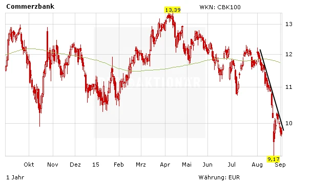 Trotz der aufbauenden Aussagen von Martin Blessing sackt die Commerzbank-Aktie am Mittwoch ab. Der kurzfristige Abwärtstrend ist intakt, die Unterstützung bei 9,17 Euro nur einen Katzensprung entfernt. Auch wenn es bald wieder eine Dividende gibt: Derzeit ist die Commerzbank-Aktie kein Kauf.