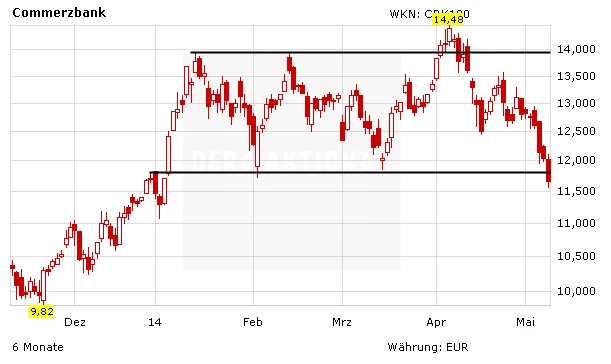 Die Analysten der Citigroup haben das Kursziel um einen auf 12 Euro reduziert, die Einschätzung wurde auf "Neutral" belassen. Die Nachricht passt damit ins Bild, das die Aktie zuletzt abgegeben hat. Notierte die Commerzbank vor den Zahlen noch über 13 Euro, drohen mittlerweile deutlich niedrigere Kurse.