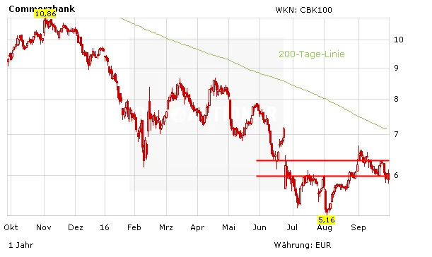 Auch wenn Commerzbank-Aktionäre kurzfristig leiden müssen, verbessern sich die Perspektiven für den gelben Riesen durch Zielkes Masterplan deutlich. Schafft der Chef die ehrgeizigen Ziele beim Konzern-Umbau, dürfte auch der Aktienkurs weiter steigen. Die heutigen Verluste sind als Reaktion auf die hohen Umbau-Kosten zu sehen und nur eine Momentaufnahme. Mutige greifen zu. Der Stopp beträgt 5,20 Euro, das Ziel des AKTIONÄR liegt bei 8,00 Euro.