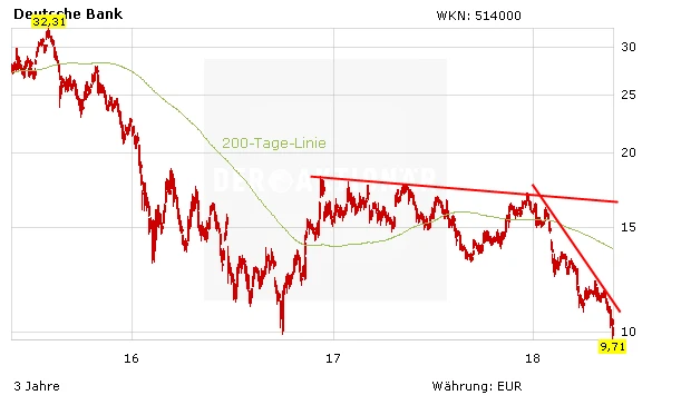 Unter erheblichen Druck geriet vor allem der europäische Bankensektor. Der italienische Banken-Index brach um bis zu 5,6 Prozent ein, so stark wie zuletzt vor knapp zwei Jahren. Sein Pendant für die Euro-Zone steuerte mit einem Minus von fünf Prozent auf den größten Tagesverlust seit Sommer 2016 zu. Die Aktie der Deutschen Bank rutschte unter die psychologisch wichtige Marke von 10,00 Euro und war mit 9,71 Euro zeitweise so billig wie zuletzt vor eineinhalb Jahren.